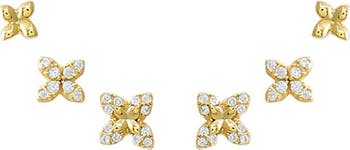 A set of solid and pave four-leaf flower stud earrings in graduated sizes. A perfect combination of shimmer and simplicity. Adds charm to any look.