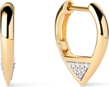 A pair of head-turning hoops in solid yellow gold. Made to last a lifetime, these bold hoops crafted in recycled solid gold feature a round design and triangle-shaped detailing with lab-grown diamonds. Style these statement hoops with our Gold Huggie Hoops and take your look to the next level.