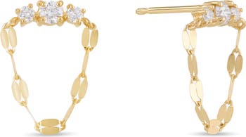 Light-catching chains drip from the front to back of these slinky earrings alight with a trio of faceted round-cut diamonds.