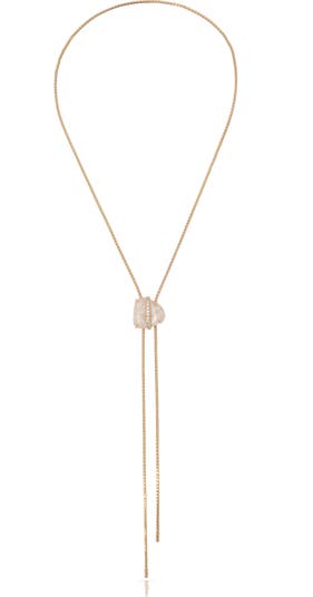 Sparkly cubic zirconia bisect a polished cabochon pendant on this striking lariat necklace designed to evoke the beauty of the desert.