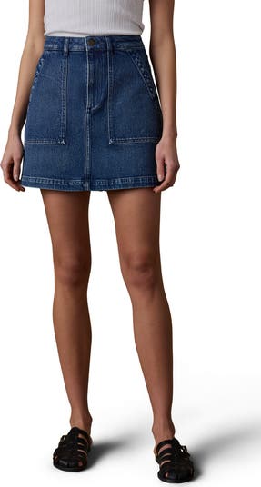 Deep front pockets bring on-trend utility style to this low-stretch denim miniskirt cast in a classic blue wash.
