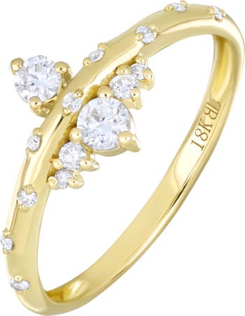 Prong-set round diamonds twinkle like stars atop, below and on this stacking ring handcrafted from warm 18-karat yellow gold.