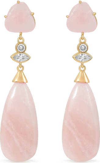 Dainty cubic zirconia sparkle from between polished rose quartz cabochons on these stunning teardrop earrings designed to evoke the beauty of the desert.