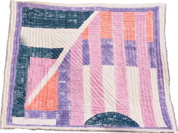 The Solstice Quilt brings a bold and modern touch to your space. The front features a striking purple geometric design, while the reverse showcases an eye-catching sun and moon motif in warm orange tones. This reversible quilt is thoughtfully handcrafted, blending traditional techniques with contemporary design for a unique and versatile addition to your home. The design is hand-pressed onto each quilt using hand-carved wooden blocks dipped in dyes. The printed cotton shells are brought to the homes of quiltmakers, who stuff and stitch the quilts by hand, creating the final product. Our quilts are made in small batches. Due to the handcrafted nature of this item, expect slight variations in the appearance of each unique piece.