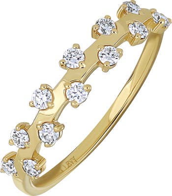 Prong-set round diamonds twinkle like stars atop and below this stacking ring handcrafted from warm 18-karat yellow gold.