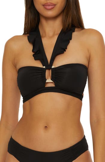 Convertible ruffle straps flutter on this bandeau bikini top, centered by a gleaming buckle and made with fully adjustable ties for a perfect fit.