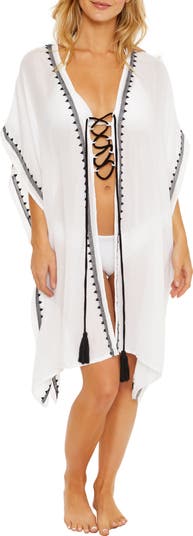 A lace-up front with tassel ties defines this breezy cover-up decorated by detailed embroidery.