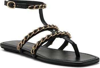 Crystal-encrusted chain-link hardware saunters over the slim leather straps of a glam sandal made in Spain and secured with an adjustable buckle closure.