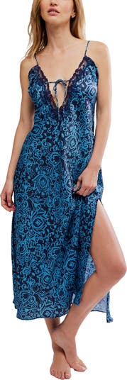 An intricate print covers this romantic and slinky slipdress featuring a deeply dipped neckline, lacy trim and a leggy slit at the hem.