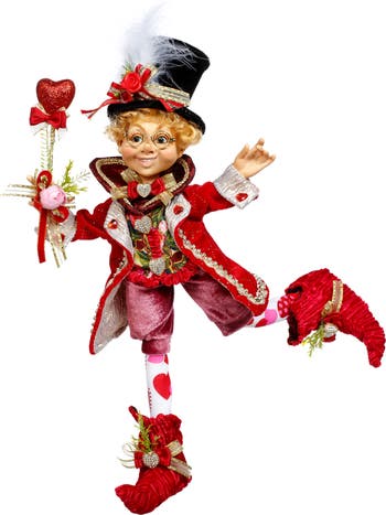 This collectible Mark Roberts Some One You Love Elfin stands 14 inches tall and is full of charm and whimsy. Dressed in elegant attire, he wears a classic tophat and holds a heart-shaped wand, symbolizing love and affection. Crafted with exquisite detail, this enchanting elfin makes a heartfelt addition to any seasonal or year-round display.