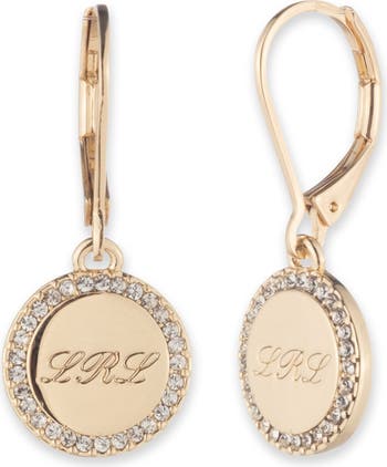 A pavé crystal halo highlights engraved monograms that brand these elegant coin drop earrings.