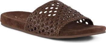 Geometric cutouts and an intricately woven upper add subtle dimension to a faux-leather slide sandal grounded by a contoured footbed for a customized feel.