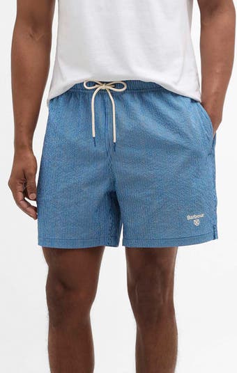Handy pockets add landworthy convenience to these seersucker swim trunks made with a comfortable drawstring waist.