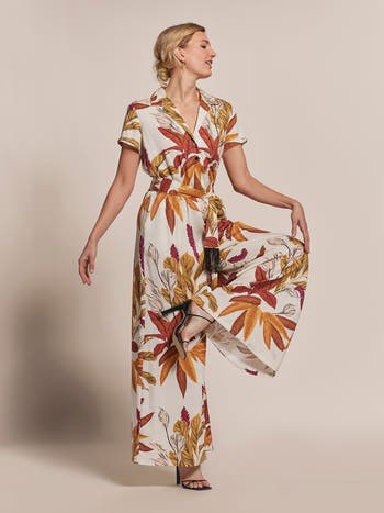 While not native to Hawai‘i, calla lilies are a familiar sight in island gardens and flower markets. They've even found their way into modern lei-making.Offering effortless coastal appeal, the Karina is a short-sleeved jumpsuit with a convertible collar and extra-wide legs. It's detailed with handmade beaded buttons and a beaded fringe sash. Â