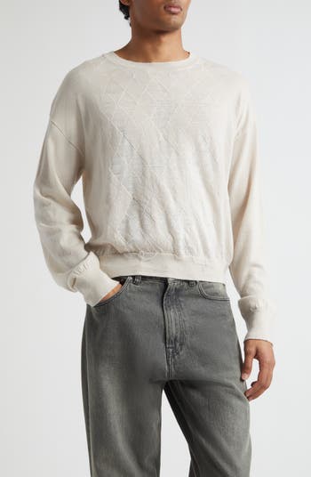 As seen in the fall ’25 lookbook, this sweater leans into a refined smoke-lounge mood with a tonal argyle that fades in and out like haze settling over soft wool. Generous dropped shoulders create a relaxed posture and deliberate distressing delivers that DIY spirit.