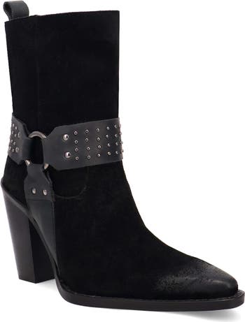 Brushed antique studs and an iconic Dingo1969 harness buckle create an elevated aesthetic on a supple suede Western boot set on a cushioned footbed and stacked heel.