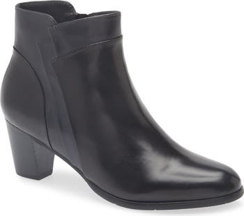 Artfully layered paneling puts a fresh spin on this classic leather bootie designed with a Western-inspired curved topline.