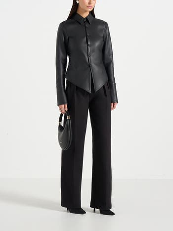 Designed in vegan leather for a sleek, modern look, this piece delivers a bold take on refined tailoring. The fitted silhouette is shaped with darted seams to create a sculpted, flattering form, while a pointed collar and tonal button front maintain a clean, minimal finish. An angular hemline enhances the waist and elongates the shape, complemented by extended tailored cuffs with button closures for added polish. A contemporary design that balances structure, precision, and effortless style.