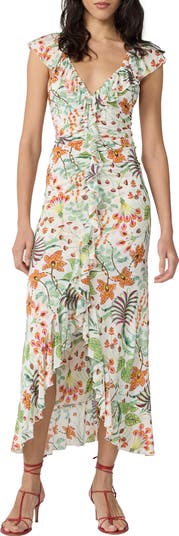 Fields of winsome wildflowers animate a deeply charming dress served with a center ruffle and deeply dipped at the neckline for a shot of sass.