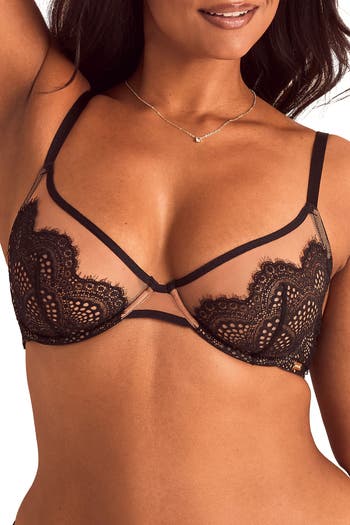 This sheer, unlined bra features a bold plunging neckline and sexy lace and tulle illusion cups. The design includes underwired support, adjustable straps, and a hook and eye closure.