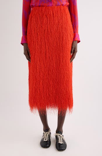 This runway-featured midi is a study in texture and restraint. A simple silhouette is made magnetic by wispy fringe that never breaks. Under Julian Klausner, the Belgian label doubles down on movement as design, delivering a skirt that changes character with every turn.