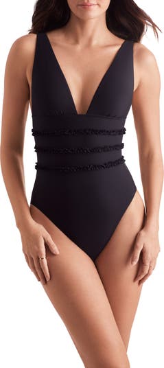 Sweeten your poolside vibe in this stretchy one-piece trimmed with fanciful frills and fronted with a plunging neckline.