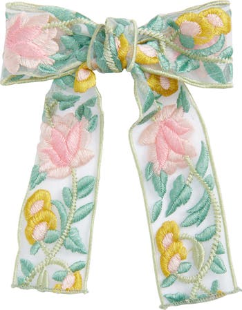 Top off your look with an element of coquettish romance with this chiffon bow barrette beautifully embroidered with blossoming flowers and twining leaves.