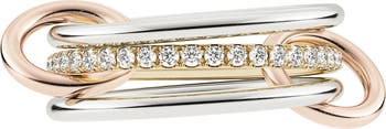 Pavé diamonds sparkle at the center of this tricolor set of three rings that are linked together to create a single elegant accent for your wardrobe.