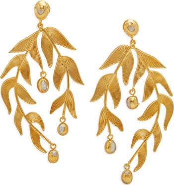 The Sooki Chandelier Earrings are handcrafted in 22k gold-plated brass, featuring scattered baroque pearls along a bold, elongated silhouette. Designed to flow gracefully down the ear, these earrings combine sculptural form with luminous details for a lightweight, dramatic statement.