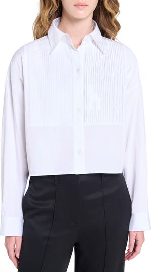 Tuxedo shirt vibes define a waist-skimming button-up that's more fun than formal.