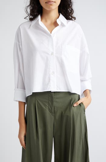 Look sharp in a crisp cotton-blend blouse fashioned with abbreviated sleeves, a single patch pocket and a modern cropped silhouette.