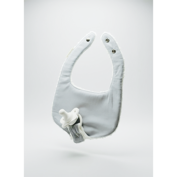 Crafted from 100% cotton, the Pacifier Bib is designed to be both gentle and functional for everyday use. The softly contoured silhouette provides comfortable coverage, while the absorbent cotton chenille backing offers a plush, breathable feel against delicate skin. The front features the print a pale ivory ground scattered with blush pink roses and soft yellow buds, inspired by vintage baby linens and timeworn nursery keepsakes. A snap closure at the neck allows for easy on and off, while the snap loop at the bottom is designed to securely hold a pacifier, keeping it close and clean throughout the day. Each bib is carefully sewn for durability and ease, intended to be washed, reused, and lived in during those early, fleeting months. Studio sample, limited quantities will not be restocked once sold out. Size: One size. Designed to fit infants approximately 3-18 months Fabric: Front: 100% Cotton Back: 100% Cotton Chenille Care: Machine wash cold on delicate. Lay flat to dry or tumble dry low. Do not bleach