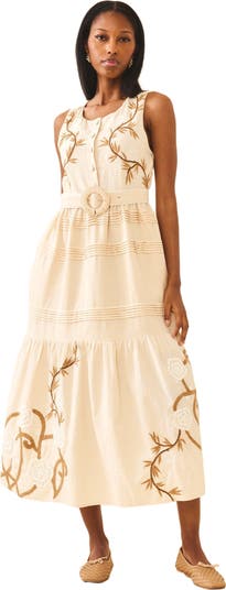Meet Sophia, a cotton linen midi dress. Box pleats in the skirt, lace trim details, and raffia placed embroidery detailing makes this dress special. Featuring side pockets, working front buttons, and a side body zipper. Removeable lace trimmed belt with rope wrap detailing allows for a customizable fit.