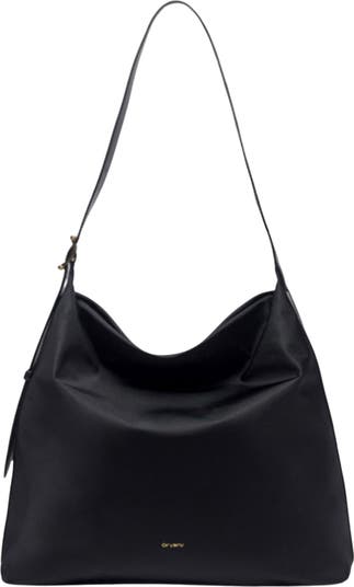 A slouchy topline and voluminous profile distinguish a durable nylon bag featuring multiple pockets and an adjustable shoulder strap for on-the-go convenience.