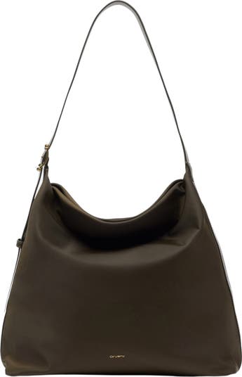 A slouchy topline and voluminous profile distinguish a durable nylon bag featuring multiple pockets and an adjustable shoulder strap for on-the-go convenience.