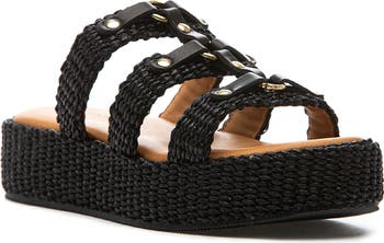 Polished hardware and smooth leather trim add a hint of modern edge to this woven platform sandal.