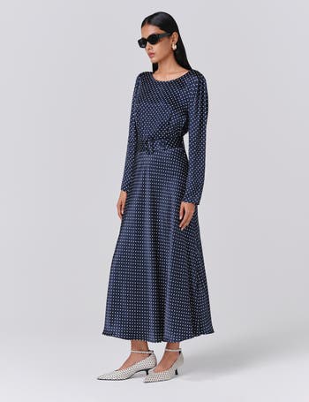 All of our pieces are designed with ease and versatility in mind, to become an essential piece of your wardrobe that will serve you for multiple occasions, not just a one-off. Nowhere is that more apparent than Sophia. A simple silhouette in our signature satin with long sleeves and a flowing mid-length skirt, we’ve added a coordinating fabric-covered belt to cinch in the waist. Keyhole and button at back neck and concealed side zip fastening