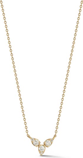 A trio of teardrop settings create a V pendant at the center of this 14-karat-gold necklace glinting with six diamonds.