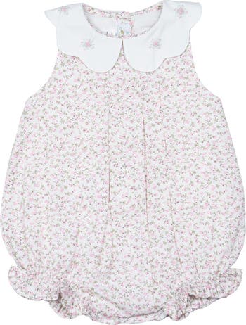 Our Sophie Bubble Romper is a hand embroidered baby girl outfit with a perfectly elegant fit. This 100% Cotton romper features a fabric with a beautiful floral print. The petite flowers in this print are the sweetest shade of pink. The white scalloped collar with hand embroidered details gives this style an elevated look. Heirloom quality made with the utmost care.