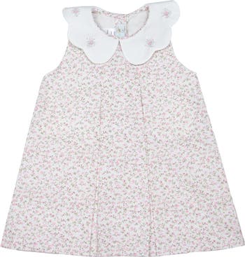 Our Sophie Dress is a hand embroidered baby girl outfit with a perfectly elegant fit. This 100% Cotton dress and bloomers feature a fabric with a beautiful floral print. The petite flowers in this print are the sweetest shade of pink. The white scalloped collar with hand embroidered details gives this style an elevated look. Heirloom quality made with the utmost care.