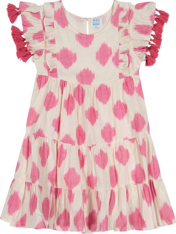 Beloved Sophie tassel dress features a scoop neckline, row of tassels at sleeves and tiered twirly skirt. 100% cotton. Single button closure at back. Fully lined.