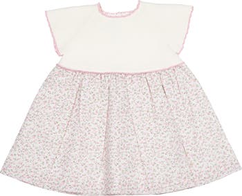 Our Sophie Knit Dress is a hand finished baby girl outfit with a perfectly elegant fit. This Pima Blend knit and floral fabric dress feature a fabric with a beautiful floral print. The petite flowers in this print are the sweetest shade of pink. The knit top with contrast color trim gives this style an elevated look. Heirloom quality made with the utmost care.