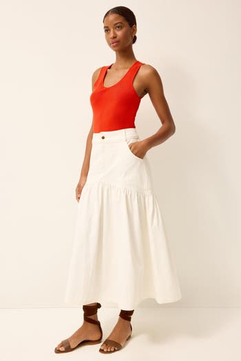 Sophie is a modern midi skirt that feels polished yet easy to wear. The curved drop-waist yoke adds subtle shape through the hips before falling into a softly flared silhouette that moves beautifully with you. Finished with a clean button-front detail| it strikes the right balance between structure and ease. An effortless anchor piece| Sophie pairs just as well with a tucked-in tee as it does with a more elevated top for everyday outfitting. Curved drop waist yoke panel Button fly Midi length 100% cotton denim Unlined Care Instructions: machine wash gentle cycle with like colors| do not bleach| tumble dry| warm iron