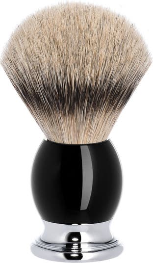Sophisticated and discerning, the SOPHIST collection is part of the MÜHLE classic range. Combining timeless forms with fine materials, SOPHIST is a celebration of traditional Rasurkultur. Made from high-grade resin, the 93K44 delivers on both durability and beauty. Presented in classic black with chrome metal highlights, the process of creating this shaving brush begins with each handle being turned out of solid resin rods. All individual pieces are then polished in several passes, giving the surface its characteristic gleam and securing its beauty for many years to come. Silvertip Badger: Natural, soft and flexible; only the best, carefully selected badger hair is used to create these handcrafted shaving brushes. Silvertip badger hair represents the finest, softest and rarest quality of badger hair available. The hair is renowned for its ability to retain large amounts of water, enabling the brush to quickly produce a dense, stable and creamy lather. Manufactured using historical tools, the semi-circular shape of the brush is created by hand when binding. The fine tips of the hair, therefore, do not require trimming and the natural softness of the hair is retained. This artisan procedure is mastered by only a few specialists worldwide, the quality of work evident in the even black band running through the predominantly silver brush head. Measurements: Ring size L: 23 mm Dimensions: 42 mm x 105 mm Weight: 116g