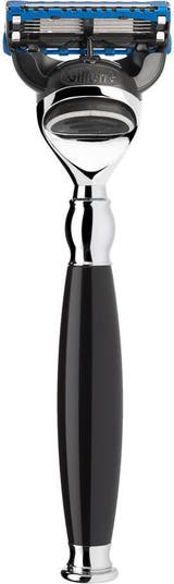 Sophisticated and discerning, the SOPHIST collection is part of the MÜHLE classic range. Combining timeless forms with fine materials, SOPHIST is a celebration of traditional Rasurkultur. The Material: Made from high-grade resin, the R44F embodies functional elegance. Presented in classic black with chrome metal highlights, the process of creating this razor begins with every handle being turned out of solid resin rods. All individual pieces are then polished in several passes, giving the surface its characteristic gleam and securing its beauty for many years to come. A premium product that produces a distinctly close and lasting shave. The Razor: Simple and safe handling, Gillette Fusion is ideal even for newcomers. It ensures a close and gentle shave with its five-blade system and precision edging blade located on the back of the cartridge. Replacement blades are available from retailers worldwide. Measurements: Dimension: 42 mm x 145 mm Weight: 60g