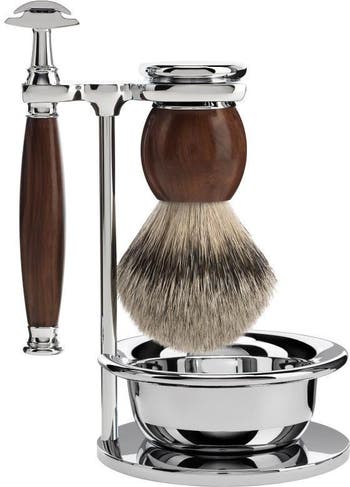 4-part shaving set with bowl, handles of ironwood with chromed metal accents: Shaving brush with silvertip badger Shaving brush size L = big shaving brush head with 23 mm ring Safety razor, compatible with classic razor blades Soap dish made of metal, chrome-plated Stand made of metal, chrome-plated The Material - Ironwood Its name speaks for itself: ironwood is one of the hardest woods in the world. Its extremely high density makes it incredibly resistant. Its dark brown colour in combination with the fine grain guarantees its silky and shiny appearance. The Brushhead - Silvertip badger Among connoisseurs, silvertip badger is regarded as the pièce de résistance: Only the best, carefully selected badger hair is used for these purely handcrafted shaving brushes. The precious natural material is particularly soft and flexible. The fine, conically tapering hairs possess the ability to retain a large amount of water and produce a dense, creamy lather. Another sign of quality is the even black band running horizontally through the predominantly silvery gleaming hair. This premium product is manufactured using historical tools in an artisan procedure mastered by only a few specialists worldwide. The semi-circular shape of the brush head is created by hand when binding the brush. The fine tips therefore do not require trimming and the natural softness of the hair is retained. The Razorhead - Classic razor blade For generations, the safety razor has been regarded as a stylish classic which can even shave edges with precision. For many, it is the razor par excellence. Its styling is ideally suited to the design of the MÜHLE products. Even if the open blade does demand a little respect at first: After a brief familiarisation period, and guided by a steady hand, it produces a very close shave and a lasting result. Unlike modern blade systems, the head of the safety razor does not move. The blades are replaced by unscrewing the cap. They can be purchased from us and by retailers everywhere. Measures: Dimensions: 120 mm x 155 mm Weight: 568g