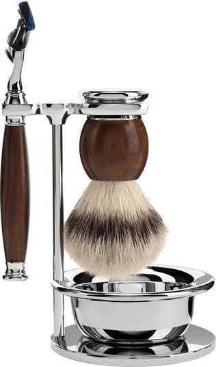 4-part shaving set with bowl, handles of Ironwood with chromed metal accents: Shaving brush with Silvertip Fiber® Shaving brush size L = big shaving brush head with 23 mm ring 5-blade-razor, compatible with Gillette® Fusion™ blade guard made of plastic Soap dish made of metal, chrome-plated Stand made of metal, chrome-plated The Material - Ironwood Its name speaks for itself: ironwood is one of the hardest woods in the world. Its extremely high density makes it incredibly resistant. Its dark brown colour in combination with the fine grain guarantees its silky and shiny appearance. The Brushhead - Silvertip Fiber® The high-quality synthetic Fibers represent a world first of our own invention. We offer a synthetically produced premium quality whose material characteristics are analogous to those of the precious natural hair, silvertip badger. The majority of the users even say that this quality actually provides better performance characteristics than the natural hair. 'Silvertip Fiber®' is very soft at its fine tips, but somewhat more stable than natural hair in the middle section. These characteristics produce a pleasant, soft sensation on the skin when the lather is applied, without having to forgo the desired firmness of the hairs in the lathering process. In daily use, the manually processed Fibers are less sensitive than natural hair as they dry more quickly and are resistant to shaving soaps and creams. The completely vegan Fibers are also somewhat easier to use than natural hair as they produce a particularly creamy and thick lather from a small amount of shaving soap or cream, which is used much more sparingly as a result. The Razorhead - Gillette® Fusion™ The latest shaving system from Gillette® embraces five blades positioned one above the other as well as a precision edging blade located on the back of the cartridge. This design ensures a very close and gentle shave. Its simple and safe handling is ideal even for newcomers. The blades are available from retailers everywhere. The blade guard made of plastic protects the blade and prevents from cuts when storing the safety razor or while traveling. Works for all MÜHLE Gillette® Fusion™ razors. Measures Dimensions: 120 mm x 182 mm Weight: 556g