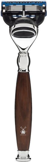 Description 5-blade razor, compatible with Gillette® Fusion™ blade guard made of plastic Handles made of Ironwood with chrome-plated metal highlights The Material - Ironwood Its name speaks for itself: ironwood is one of the hardest woods in the world. Its extremely high density makes it incredibly resistant. Its dark brown color in combination with the fine grain guarantees its silky and shiny appearance. The Razorhead - Gillette® Fusion™ The latest shaving system from Gillette® embraces five blades positioned one above the other as well as a precision edging blade located on the back of the cartridge. This design ensures a very close and gentle shave. Its simple and safe handling is ideal even for newcomers. The blades are available from retailers everywhere. The blade guard made of plastic protects the blade and prevents from cuts when storing the safety razor or while traveling. Works for all MÜHLE Gillette® Fusion™ razors. Measures Dimension: 42 mm x 145 mm Weight: 62g We would like to point out that structural and color deviations are possible in the natural materials that we use.