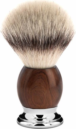Description Shaving brush with Silvertip Fiber® Ring size L: 23 mm Handles made of Ironwood with chrome-plated metal highlights The Material - Ironwood Its name speaks for itself: ironwood is one of the hardest woods in the world. Its extremely high density makes it incredibly resistant. Its dark brown colour in combination with the fine grain guarantees its silky and shiny appearance. The Brushhead - Silvertip Fiber® The high-quality synthetic Fibers represent a world first of our own invention. We offer a synthetically produced premium quality whose material characteristics are analogous to those of the precious natural hair, silvertip badger. The majority of the users even say that this quality actually provides better performance characteristics than the natural hair. 'Silvertip Fiber®' is very soft at its fine tips, but somewhat more stable than natural hair in the middle section. These characteristics produce a pleasant, soft sensation on the skin when the lather is applied, without having to forgo the desired firmness of the hairs in the lathering process. In daily use, the manually processed Fibers are less sensitive than natural hair as they dry more quickly and are resistant to shaving soaps and creams. The completely vegan Fibers are also somewhat easier to use than natural hair as they produce a particularly creamy and thick lather from a small amount of shaving soap or cream, which is used much more sparingly as a result. Measures: Dimensions: 42 mm x 105 mm Weight: 120g