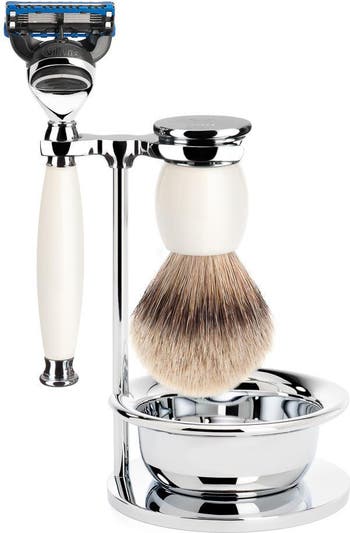 4-Piece shaving set with bowl, including: Silvertip Badger Shaving Brush Gillette Fusion Razor Chrome-plated Soap Dish Chrome-plated Metal Stand Sophisticated and discerning, the SOPHIST collection is part of the MÜHLE classic range. Combining timeless forms with fine materials, SOPHIST is a celebration of traditional Rasurkultur. The Material: Made from delicate porcelain with chrome metal highlights, the history of the porcelain is said to date back over 2,000 years. Each product is shaped, glazed and fired by hand to achieve the classic clean and elegant finish. Silvertip Badger: Natural, soft and flexible; only the best, carefully selected badger hair is used to create these handcrafted shaving brushes. Silvertip badger hair represents the finest, softest and rarest quality of badger hair available. The hair is renowned for its ability to retain large amounts of water, enabling the brush to quickly produce a dense, stable and creamy lather. Manufactured using historical tools, the semi-circular shape of the brush is created by hand when binding. The fine tips of the hair, therefore, do not require trimming and the natural softness of the hair is retained. This artisan procedure is mastered by only a few specialists worldwide, the quality of work evident in the even black band running through the predominantly silver brush head. The Razor: Simple and safe handling, Gillette Fusion is ideal even for newcomers. It ensures a close and gentle shave with its five-blade system and precision edging blade located on the back of the cartridge. Replacement blades are available from retailers worldwide. Measurements: Dimensions: 120 mm x 155 mm Weight: 580g
